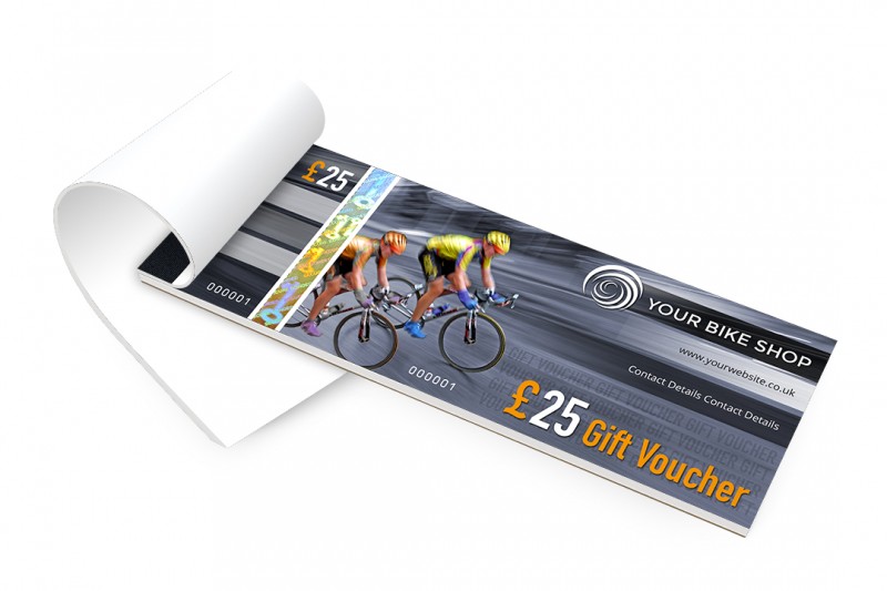This cycling themed gift voucher design is perfect for a bike shop, and we can match the text colours to your brand.